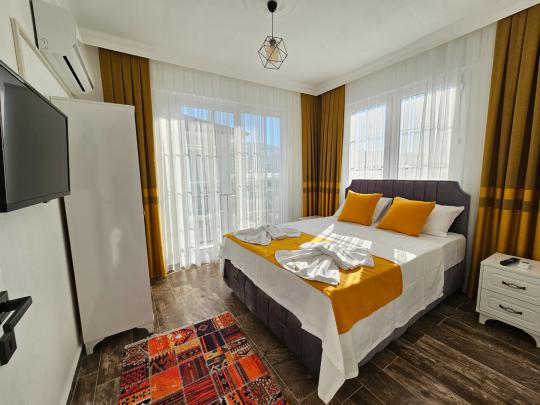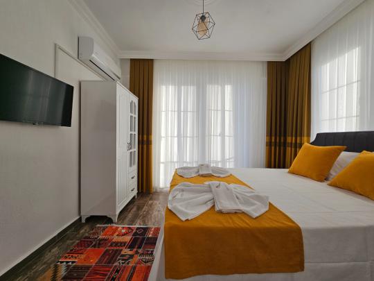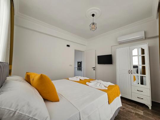 İkinci yatak odası içerisinde bir adet çift kişilik yatak, TV ve klima,
