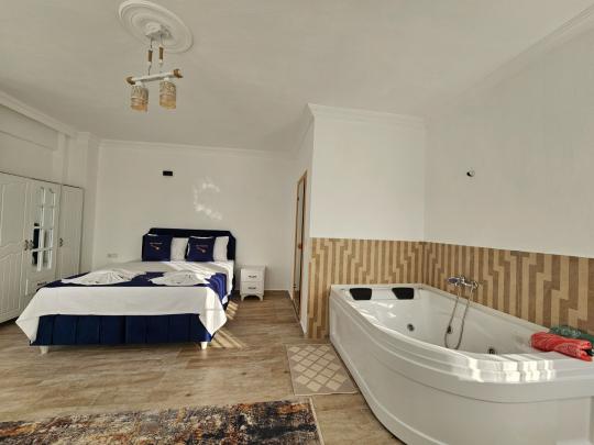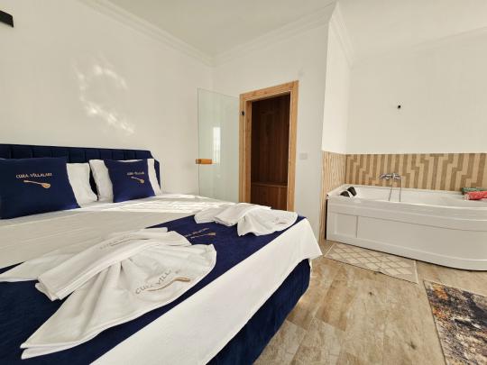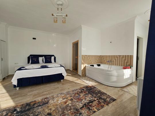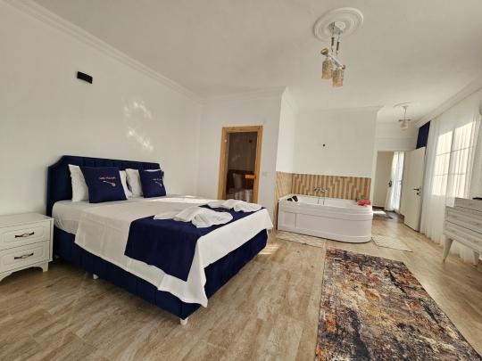 Birinci yatak odası içerisinde bir çift kişilik yatak, ebeveyn banyosu, jakuzi, TV ve klima,