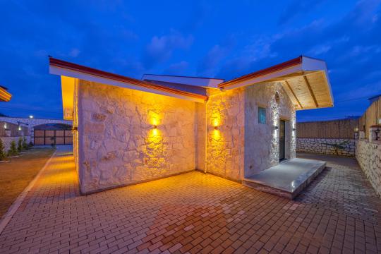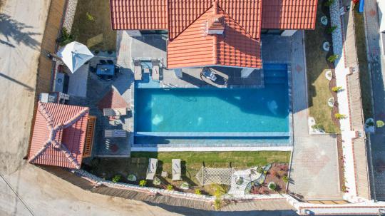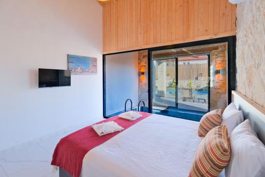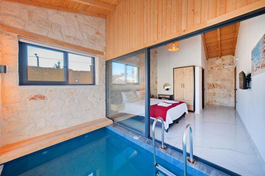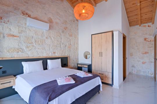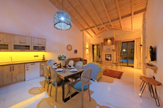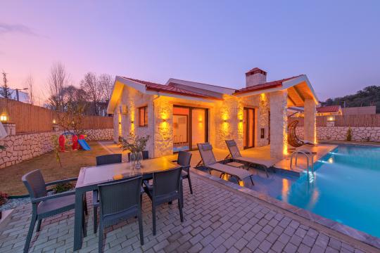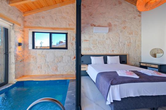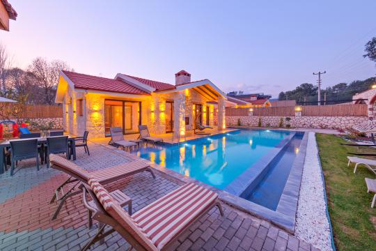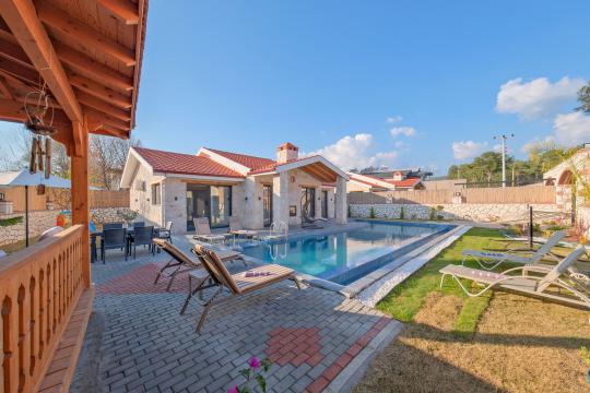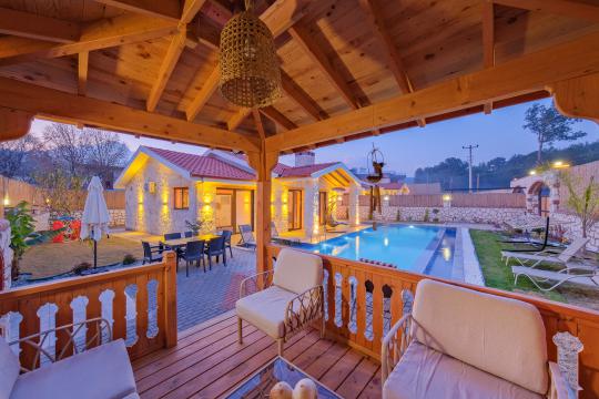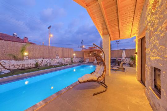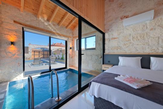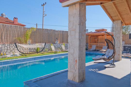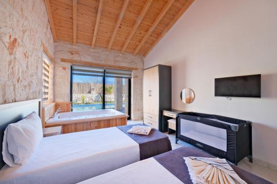 Taş ve ahşabın bir araya gelerek, doğadan ilham alınmış etkileyici bir mekan sunan villamızın havuz terasında kapasiteye uygun şezlong takımı, oturma grubu ve barbekü alanı bulunmakta olup, yine havuz terasına açılan konforlu oturma odası ve tam donanımlı açık mutfağı, bir yatak odasında çift kişilik yatak, ebeveyn banyosu ve kapalı havuz; diğer yatak odasında da iki tek kişilik yatak, ebeveyn banyosu ve jakuzi bulunmaktadır. Ayrıca yerden ısıtma ve sauna da bulunan villada dört mevsim tatil yapabilmeniz ve konforunuz için her detay düşünülmüştür. Bağlamın tadına varacağınız, ayrıcalıklı bir tatilin keyfini sürebileceksiniz.