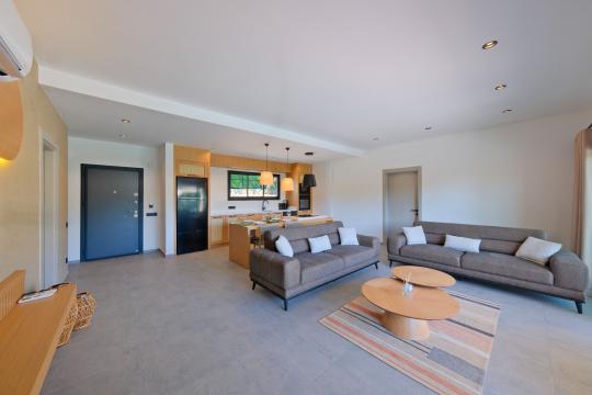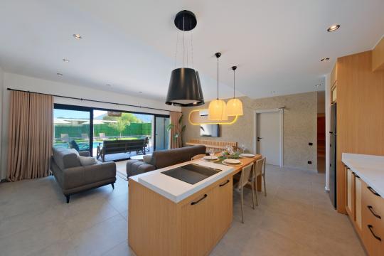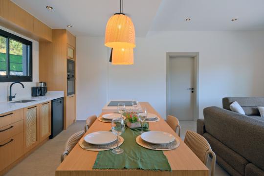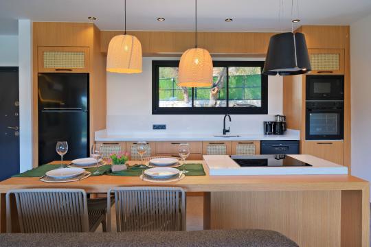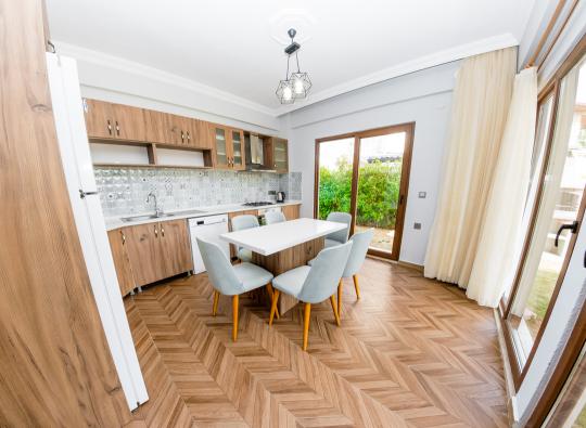 Mutfak : Villamızın modern mutfağında siz değerli misaifrlerimizin ihtiyacı olan her şey mevcut olup;Buzdolabı, mikrodalga fırın,fırın,4’’lü ocak, bulaşık makinesi,elektrikli su ısıtıcısı (kettle),tava & tencere takımı , 4 kişilik yemek takımı , çatal bırak takımı , bardak ve kahve fincanı takımı , ekmek kızartma ve tost makinası , kahve makinası ve siz değerli misafirlerimiz için ada mutfak konseptinde yemek masası bulunmaktadır.