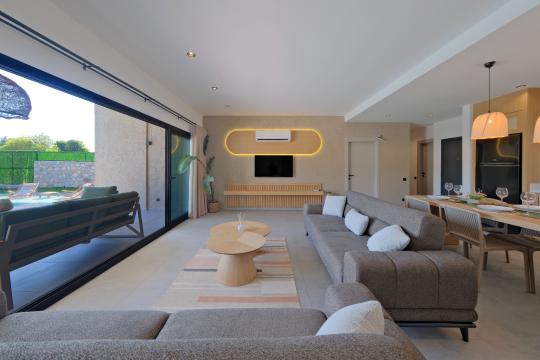 Salon: Villamızın salonunda siz değerli misafirlerimiz için 1 adet rahat konforlu oturma gurubu,mini orta sehpa, LCD TV,klima bulunmaktadır