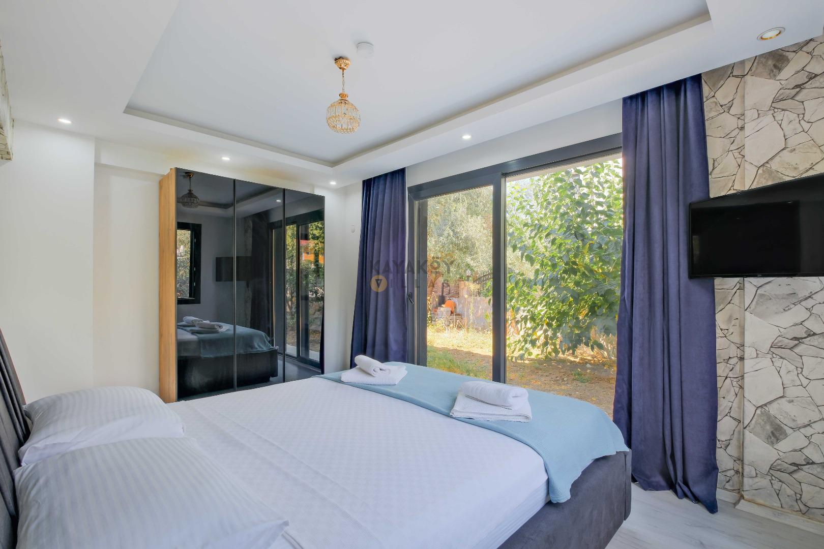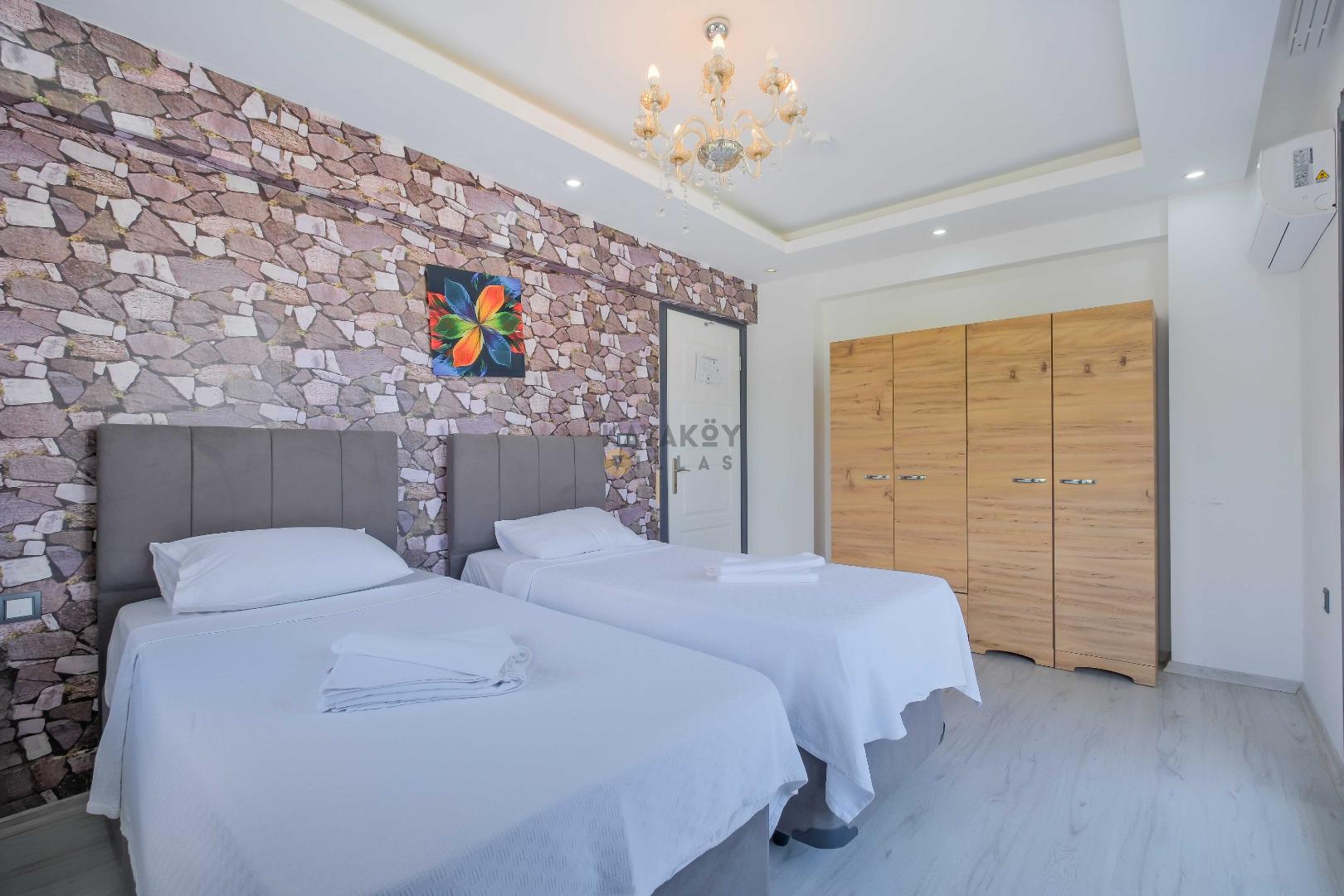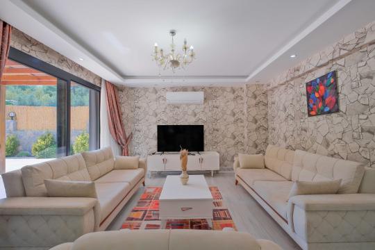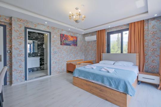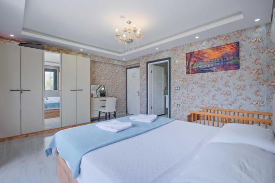 Villamızın içerisinde dört yatak odası bulunmaktadır. Birinci yatak odasında bir adet çift kişilik yatak yer almaktadır. İkinci yatak odası içerisinde bir adet çift kişilik yatak, ebeveyn banyosu, klima mevcuttur. Üçüncü yatak odası içerisinde iki adet tek kişilik yatak, ve klima bulunmaktadır. Dördüncü yatak odasında iki adet tek kişilik klima yer almaktadır. Ortak alanda ise açık mutfak - salon, 2 adet WC - Duş, klima yer almaktadır. Toplamda 8 kişinin rahatlıkla konaklayabileceği villamız unutulmaz bir tatil için sizleri beklemektedir.