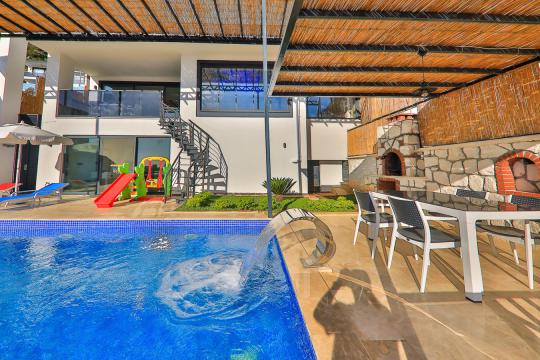 Detayları : 4 Kişilik masa ve sandalye, Barbekü, 4 Adet şezlong, 2 Adet güneş şemsiyesi, Salıncak, Özel yüzme havuzu, Çocuk oyun parkı