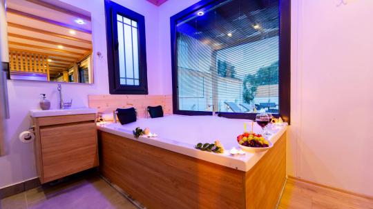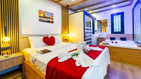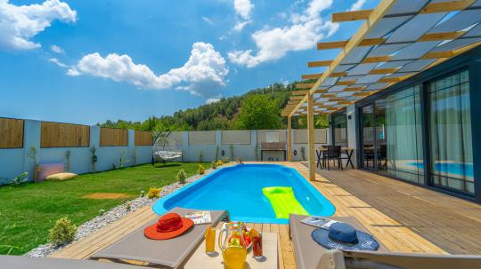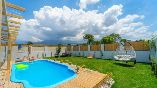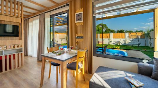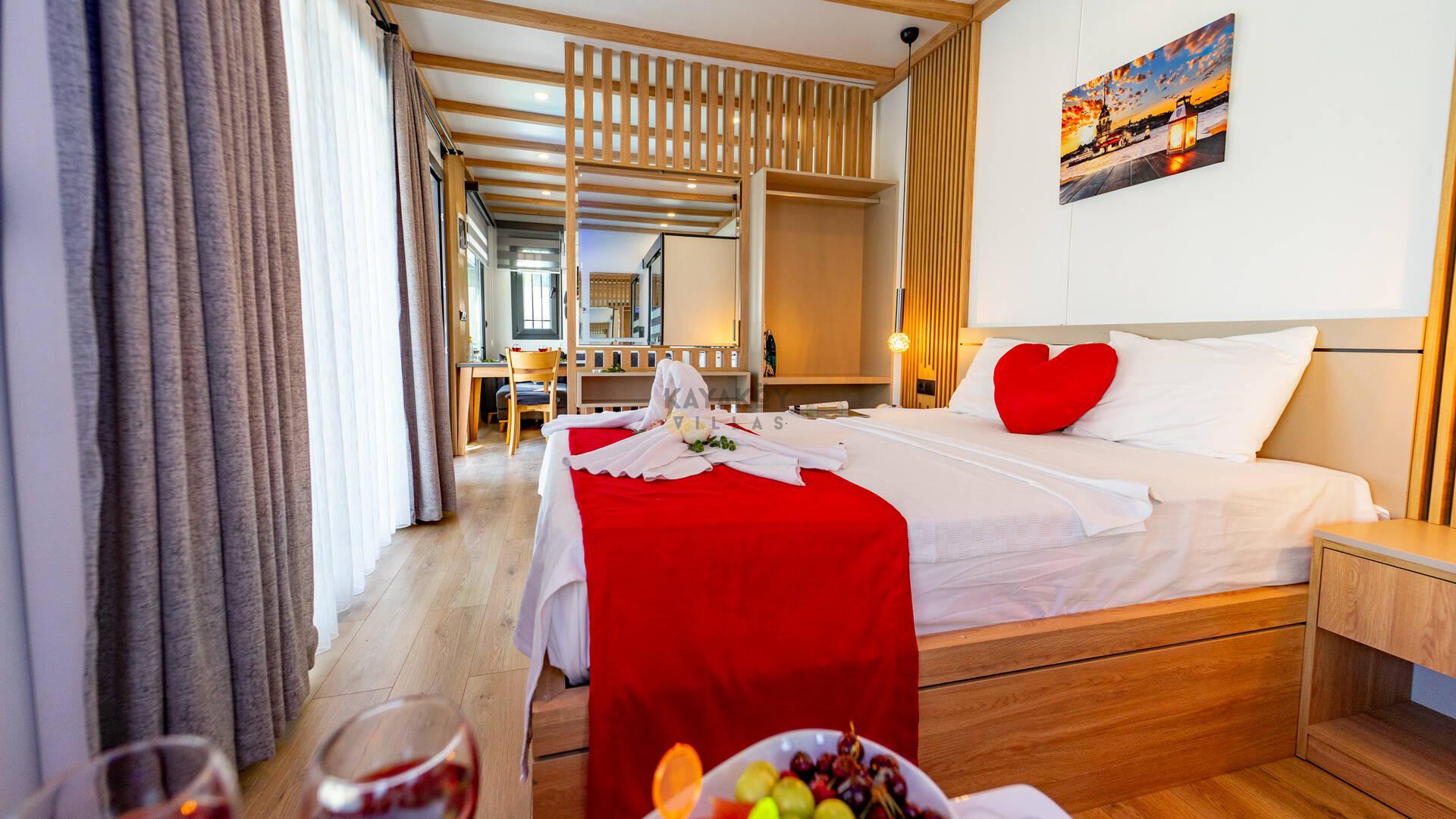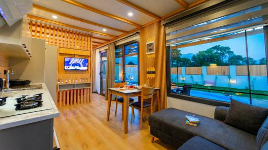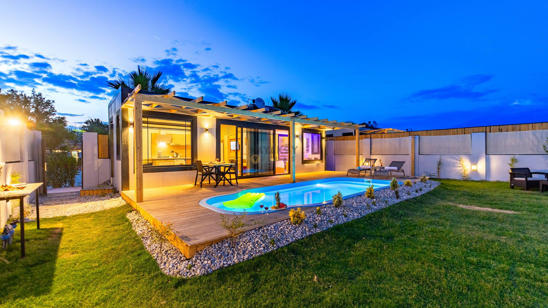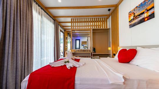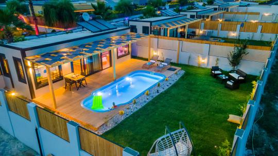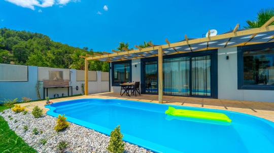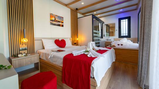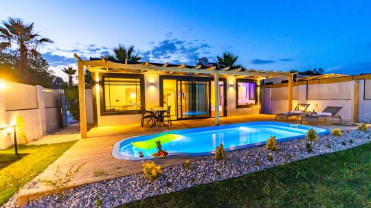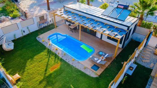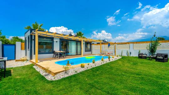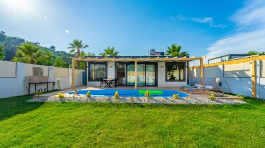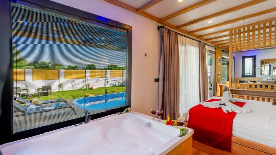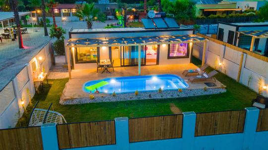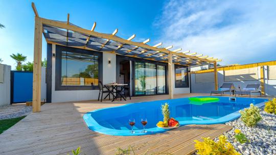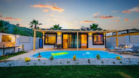 Villamız 1 yatak odasından oluşmuş, 2 kişi konaklama kapasitesine sahiptir. Balayı çiftleri için oldukça idealdir. Oldukça şık ve modern bir şekilde döşenmiş olan villamızda misafirlerimiz için her şey düşünülmüştür. Havuz terasında bulunan şezlonglarda güneşlenebilir, bahçe masasında muhteşem yemekler yiyebilir, salıncakta sallanıp keyifli dakikalar geçirebilirsiniz.