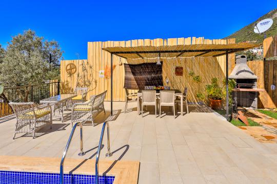 Villanın dış mekânında korunaklı özel yüzme havuzu bulunur; havuz çevresinde şezlonglar, veranda oturma alanı, barbekü/mangal köşesi ve geniş bahçe gibi detaylar yer alır. Havuz alanı, dışarıdan görünmeyecek şekilde tasarlandığı için özellikle mahremiyetli bir tatil isteyenler için uygundur. Ayrıca çocuklar için sığ bölge ve oynama alanı gibi özellikler de mevcuttur.