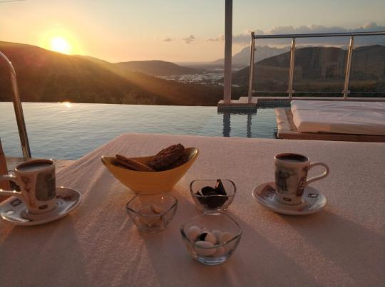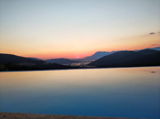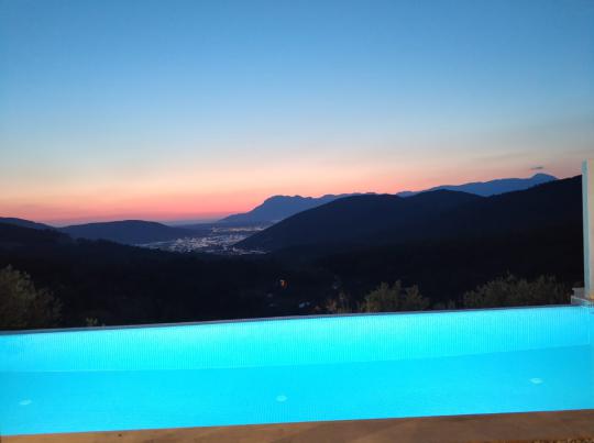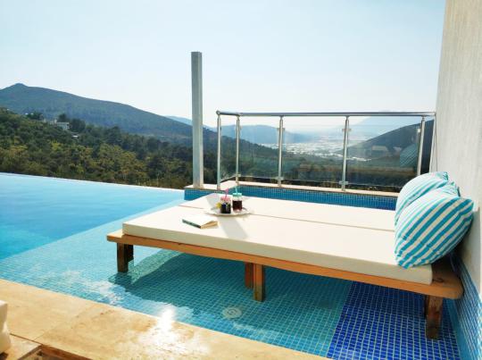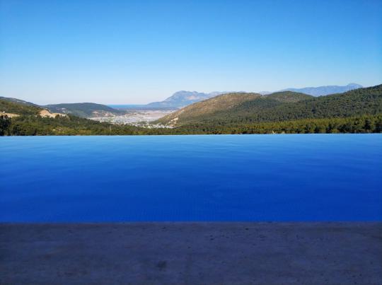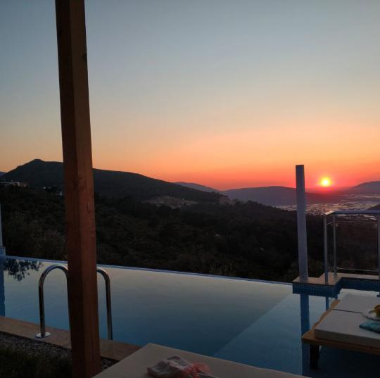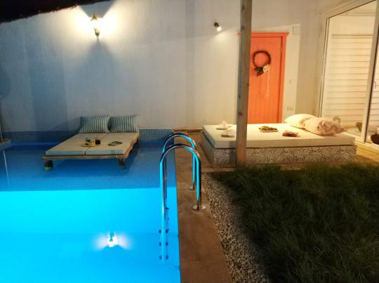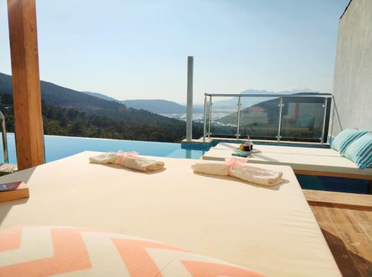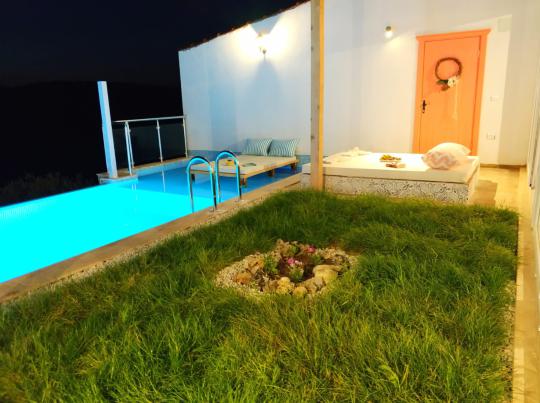 Havuz terasında küçük bir çim bahçesi, keyif yatağı ayrıca havuz içerisinde sığ havuzda çift kişilik sevgili şezlongu bulunmaktadır.Sonsuzluk havuzu dediğimiz Infinity şeklindeki havuzumuzun önü daha muhafazakar olması açısından istenirse perdeleri ile kapatılabilir.