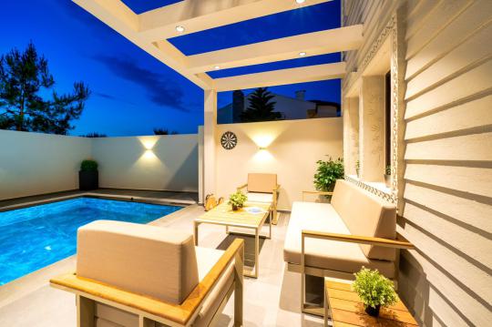 Salon : Salon içerisinde şık ve konforlu bir oturma grubu, plazma TV, klima, Mama Sandalyesi, Klima, WC/Lavabo ve havuz bölümüne direk çıkış bulunmaktadır.