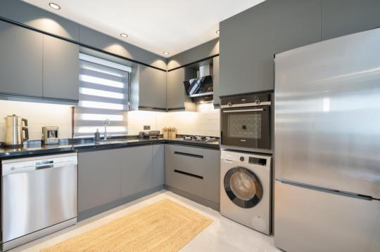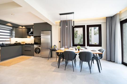 Mutfak : Modern Amerikan mutfak içerisinde buzdolabı, bulaşık makinesi, çamaşır makinesi, fırın, mikrodalga fırın, 4’lü ocak seti, çay makinesi, tost makinesi, kahve makinesi, mutfak araç gereçleri(batdak, tabak, tencere&tava, çata,bıçaklar vb.) ve 6 kişilik yemek masası yer almaktadır.