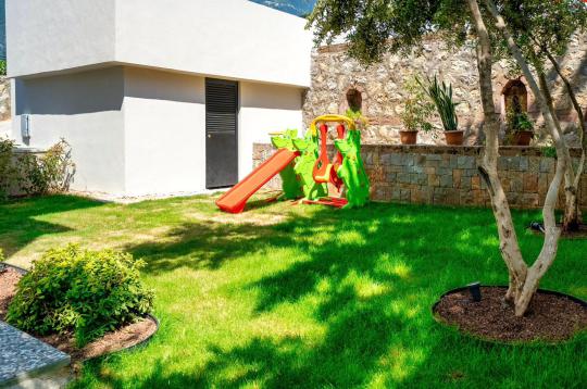 Bahçe : Yemyeşil bahçe içerisinde özel yüzme havuzu ve şezlong, güneş şemsiyesi, yemek masası, barbekü, bahçe oturma grubu, damla salıncak yer almaktadır. Ayrıca çocuklar için oyun parkı(kaydırak) da bulunur.
