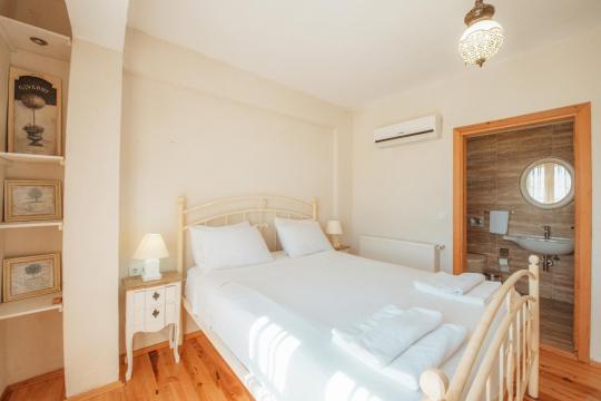 1. Yatak Odası: Klimalı, suit aile yatak odasıdır. 1 adet çift kişilik yatak, elbise dolabı, komodin, makyaj masası, banyo ve Fransız balkon bulunmaktadır. Suit aile yatak odası 1. Kattadır.