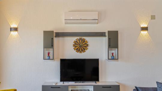 Salon : Oturma grubu, uydu alıcısı, TV, klima, lavabo, ütü, ütü masası, şömine, elektrik süpürgesi.