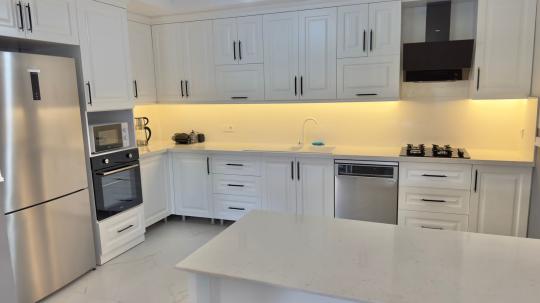 Mutfak : Modern Amerikan mutfak içerisinde buzdolabı, bulaşık makinesi, ankastre fırın, 4’lü ocak seti, su ısıtıcısı(kettle), mutfak gereçleri(tencere, tava, bardak, tabak vb.), yemek masası ve havuz bölümüne direkt çıkış yer almaktadır.