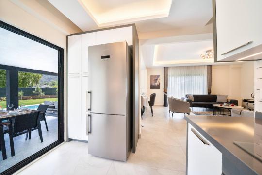 Villamız toplamda 6 kişi kapasitelidir. Toplamda 3 yatak odası ve 3 adet ebeveyn banyosu bulunaktadır ayrıca ortak kullanım alanı içerisinde bir adet WC bulunmaktadır. Birinci yatak odası içerisinde bir adet çift kişilik yatak, WC-Duş ve klima yer almaktadır. İkinci yatak odası içerisinde iki adet tek kişilik yatak WC-Duş ve klima bulunmaktadır, Üçüncü yatak odası içerisinde bir adet çift kişilik yatak WC-Duş ve klima bulunmaktadır. Ortak kullanım alanında ise WC, klima ve TV yer almaktadır.