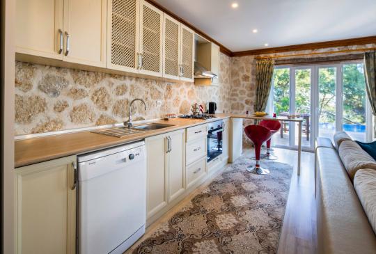 Mutfak Modern açık Amerikan mutfak, Mutfağı tam donanımlıdır, sıcak su ısıtıcısı (kettle), ankastre fırın, dörtlü ocak, davlumbaz, bulaşık makinesi, çamaşır makinesi, çatal, kaşık, bıçak, tavalar vs. yer almaktadır.