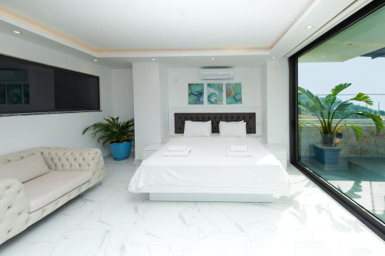 3. Yatak Odası : Çift kişilik bir adet yatak, elbise dolabı, komodin, klima, banyo ve tuvalet bulunmaktadır. ( Villanın giriş kapısının hemen yanında yer almaktadır. )