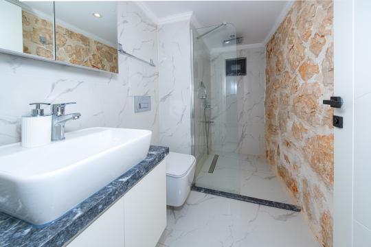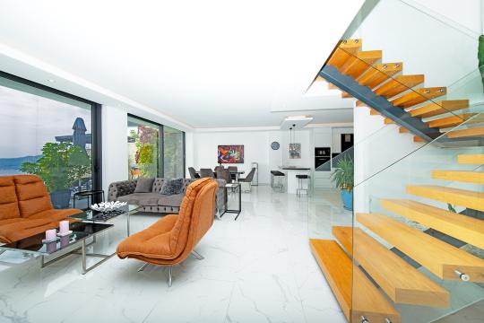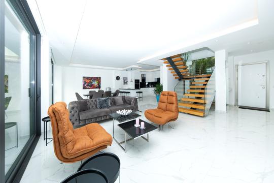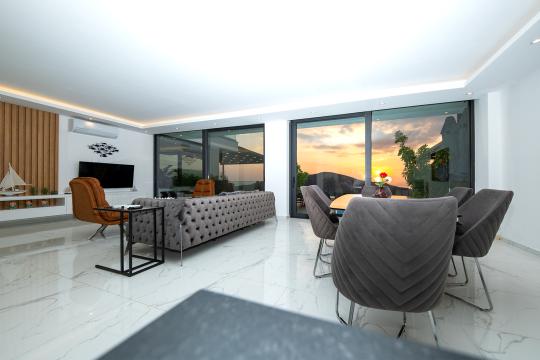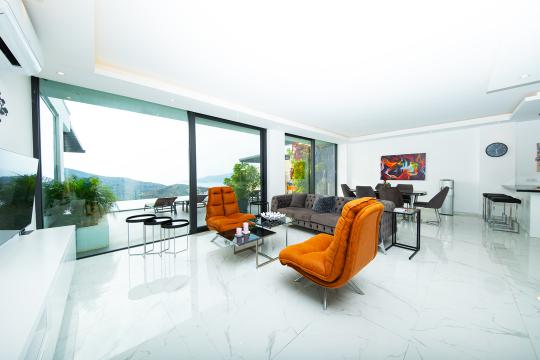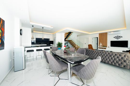 Salon : Geniş, aydınlık ve ferah salon içerisinde konforlu ve lüks oturma grubu, TV, DVD oynatıcı, klima ve sehpa yer almaktadır. Salondan havuz terasına geçiş vardır.